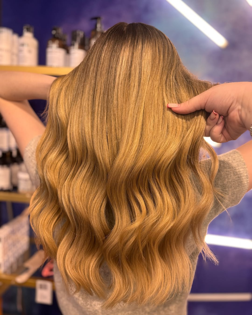 This Soft Waves with Honey Blonde Balayage is the perfect choice for those who love natural-looking dimension and effortless movement in their hair. The soft waves enhance the balayage effect, creating a seamless blend of warm blonde tones that give the hair a sun-kissed glow. The length allows for versatility—whether worn down or styled into an elegant updo.