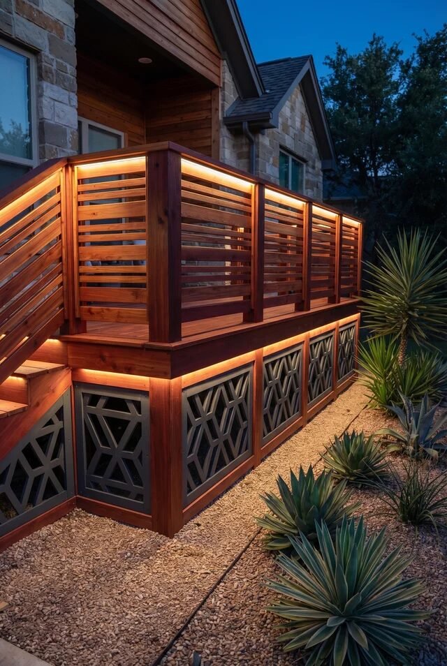 If we’re going this route, commitment is key. Choose a consistent color story (earth tones work best), and integrate lighting early in the plan. This isn’t a last-minute add-on situation. And maybe keep the rest of the deck simple… because this skirting is already doing the most (in a good way).