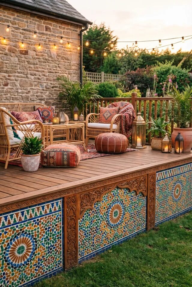 If we’re recreating this, commit to the look. Half-measures will just feel confusing. Use outdoor-rated tiles or patterned panels, and pair them with warm wood tones to keep things grounded. Layer in textiles—rugs, cushions, lanterns—to echo the vibe. It’s a little extra, yes… but in the best way possible.