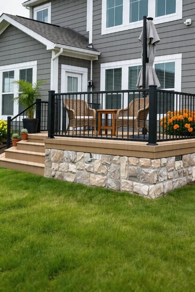 This one is giving “we have our life together” energy. The stone skirting instantly makes the deck feel permanent, like it’s part of the house rather than an add-on we impulsively decided on after one Pinterest scroll. It’s structured, solid, and honestly a little bit fancy without trying too hard.