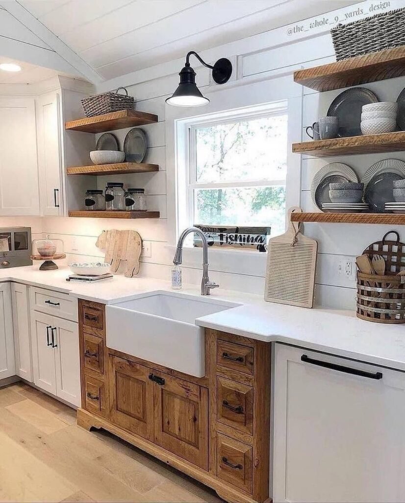 Floating wood shelves repeat the lower cabinet tone, visually connecting upper and lower halves. Black hardware and the wall sconce add tiny punctuation marks, preventing the space from drifting into beige-on-beige territory. It’s subtle edge. Farmhouse with boundaries.