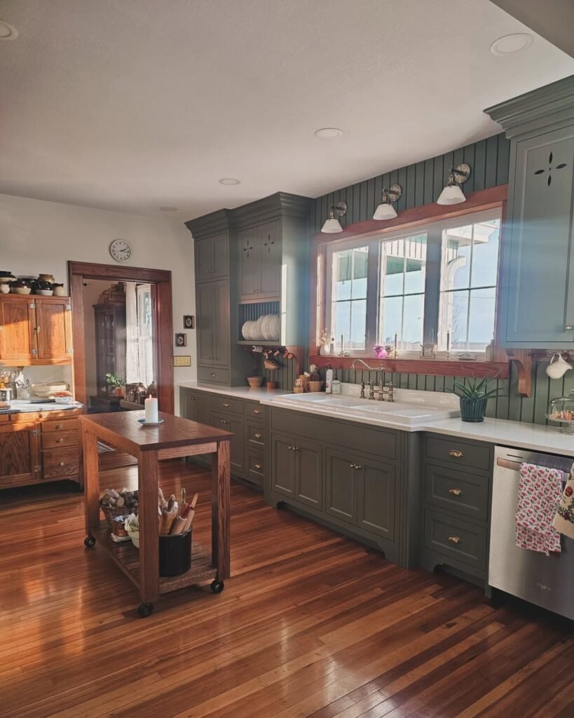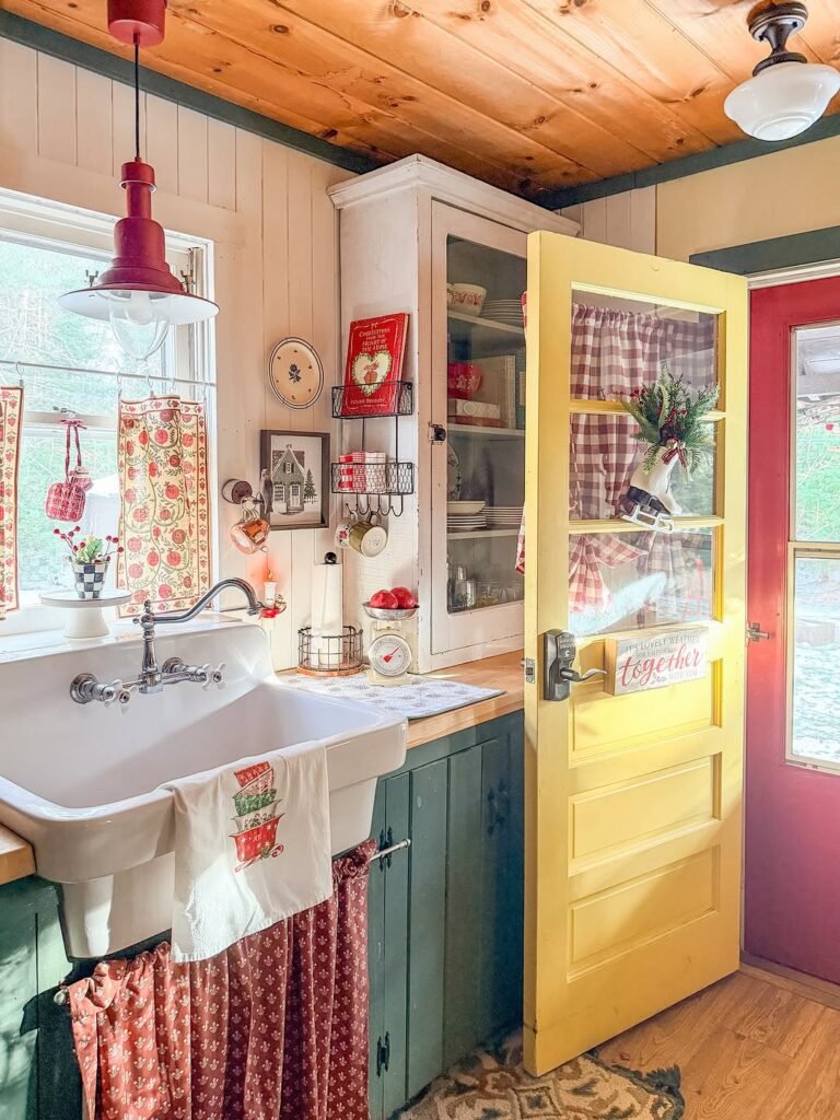 Notice the repetition of red across textiles, decor, and even the adjacent door. That consistency prevents the space from feeling random. The green lower cabinets ground the palette, while warm wood ceilings keep it rustic. It’s controlled maximalism, not design anarchy.