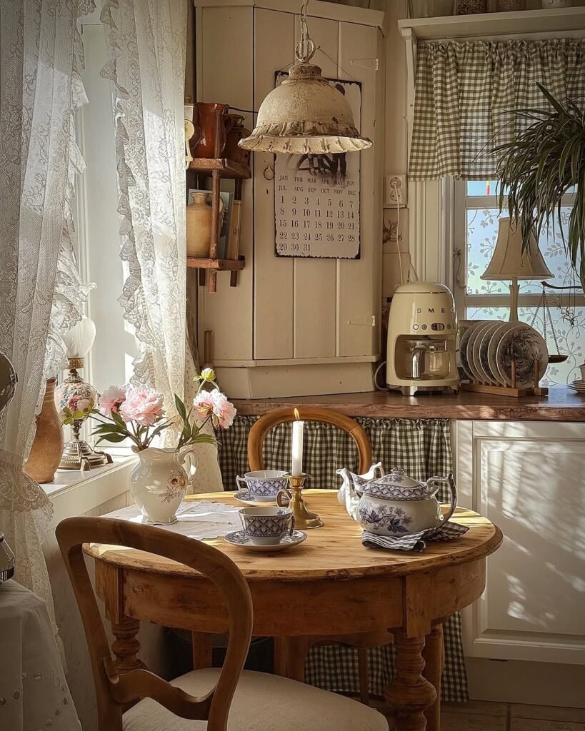 This kitchen corner feels like it time-traveled from a cottage novel, and honestly, we’re here for it. The design principle at play is intimacy through scale. A small round table softens the angular cabinetry, while lace curtains filter light into a dreamy glow. It’s giving slow mornings and zero emails.