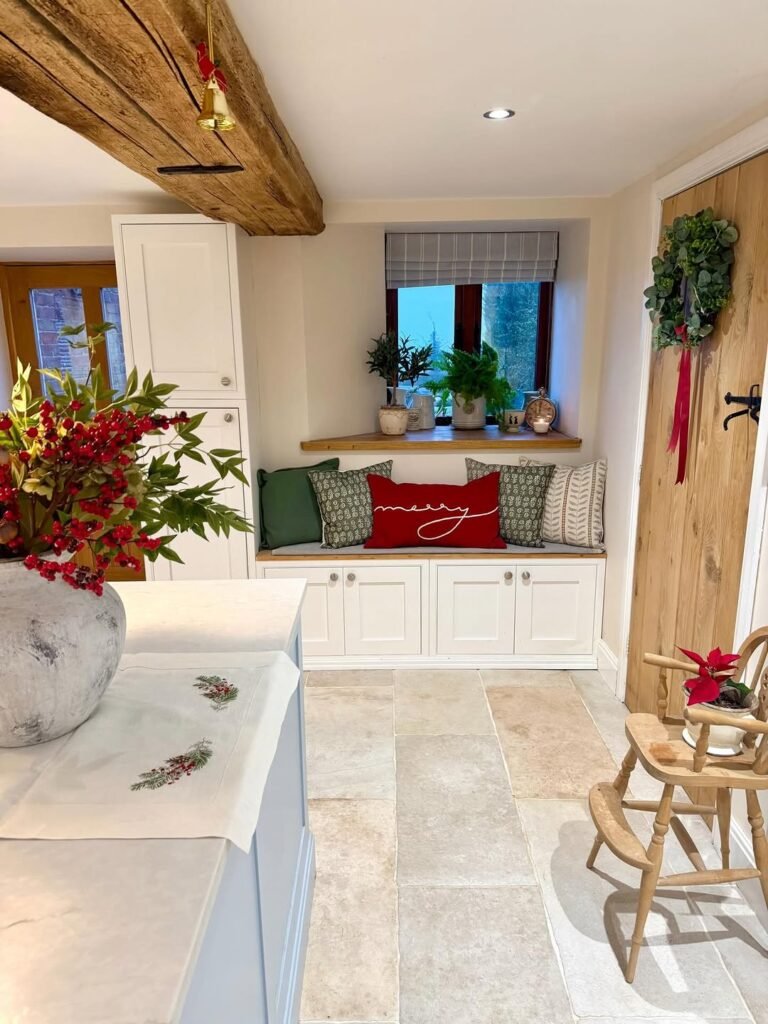 If we’re recreating this, think layering. Start with neutral cushions, add one bold seasonal accent, then echo that color somewhere else in the space. Keep wood tones warm for authenticity. And please don’t overcrowd the bench. Cozy reading corner, yes. Santa’s waiting room, no. We want festive, not frantic.