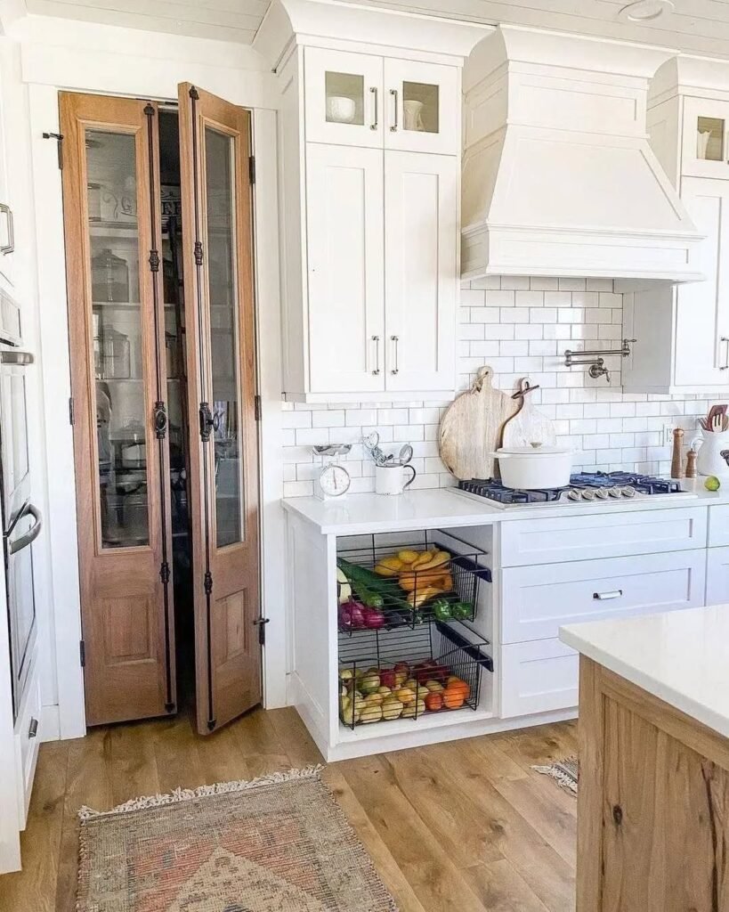 The white range hood and subway tile keep the backdrop simple, allowing the pantry doors to shine without competition. Even the produce baskets below introduce functional texture. It’s practical styling. We love a kitchen that multitasks without flexing too hard.