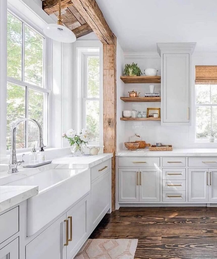 To recreate this, mix one strong rustic element with clean cabinetry. Keep countertops light to maintain airiness. Repeat wood tones strategically so they feel intentional, not leftover. And don’t overcrowd the shelves. A few ceramics, greenery, maybe a framed piece. Let negative space breathe. White works when it’s layered, not sterile.