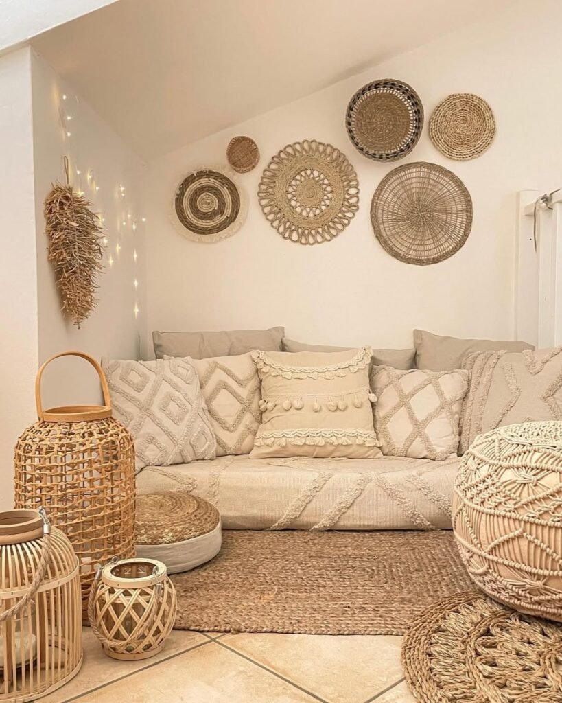 Some spaces prove that boho doesn’t always need color to have personality. This corner leans into an almost monochrome palette of sand, cream, and natural fibers—and somehow it still feels rich. The trick is texture stacking. Woven baskets, macramé poufs, rattan lanterns, and a chunky jute rug create layers that keep the room from feeling flat.