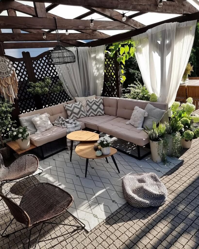 The draped white curtains soften the structure and add movement when the wind passes through. Pair that with woven lantern lighting and textured pillows, and suddenly the patio feels like a resort-level chill zone.