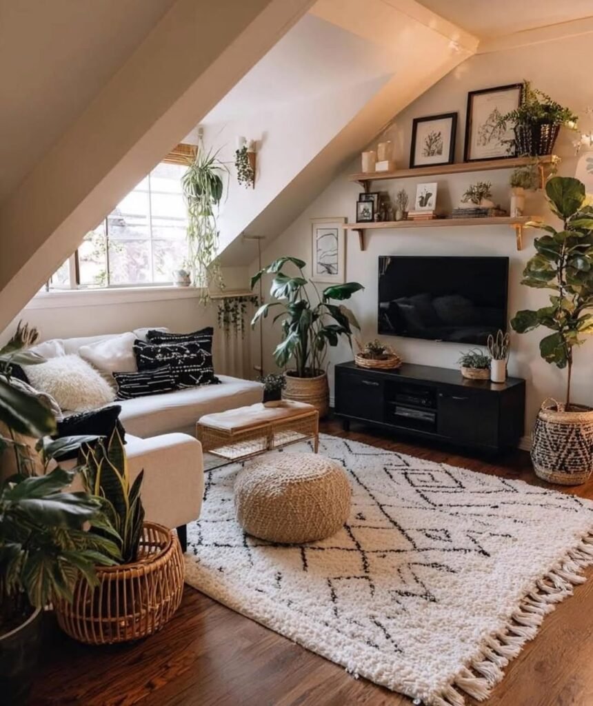 If we were recreating this, we’d focus on three things: low furniture, vertical greenery, and floating shelves. Low sofas prevent the ceiling from feeling oppressive, while trailing plants pull the eye upward in a relaxed way. And floating shelves above the TV? Cute but strategic. They add height without clutter. Honestly, attic living rooms deserve more hype.