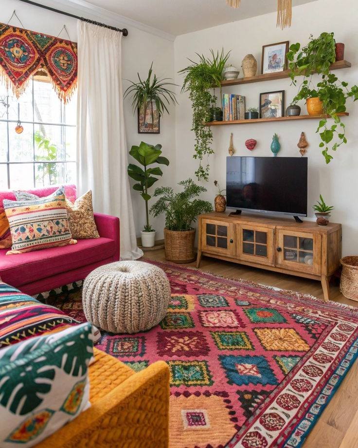 If we’re recreating this, start with the rug first. Seriously. Let it dictate the palette for pillows, artwork, and accents. Boho spaces thrive on personality, and sometimes personality just happens to come in hot pink and mustard.