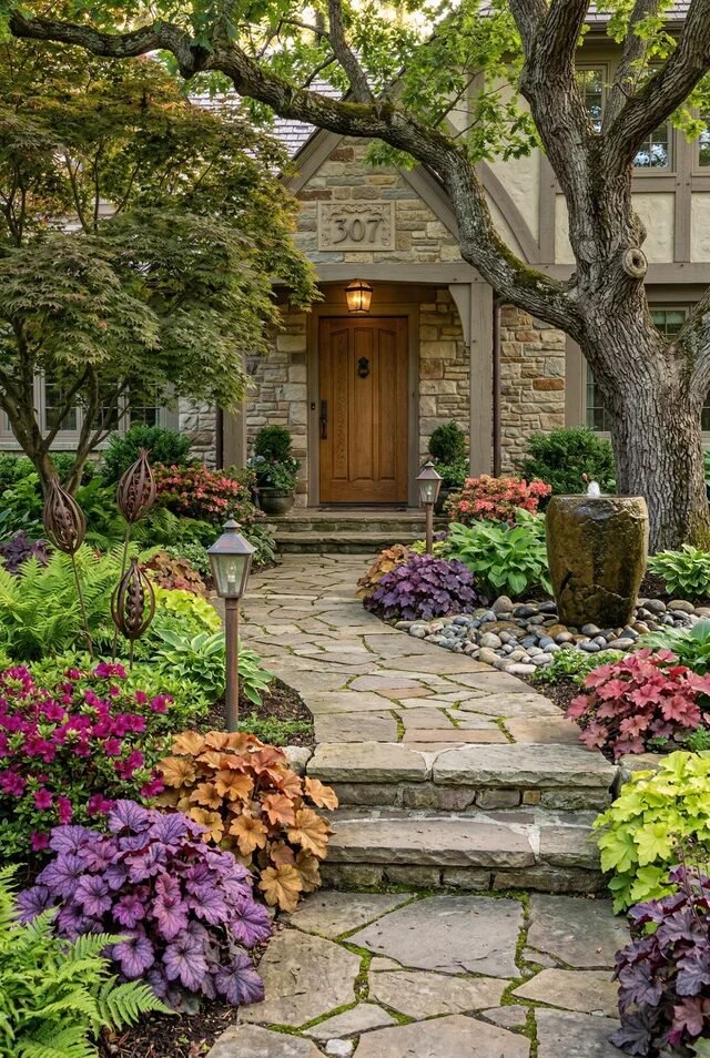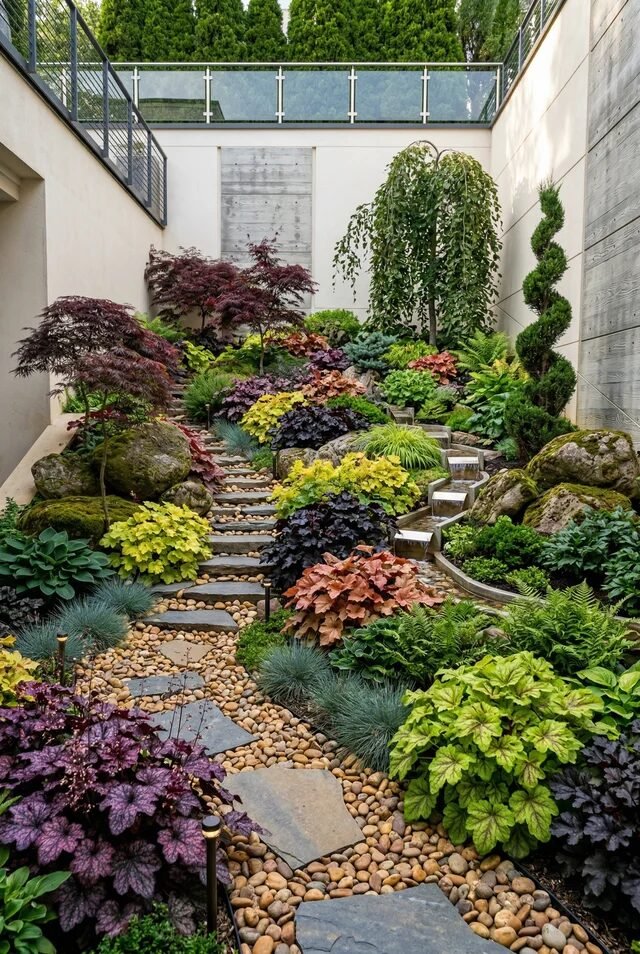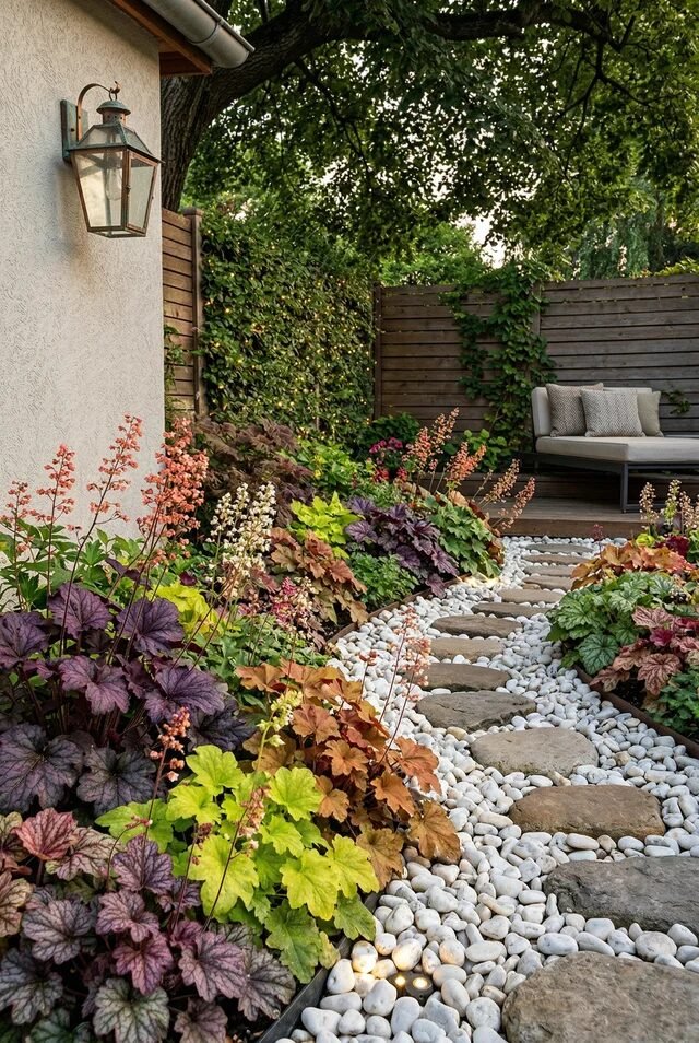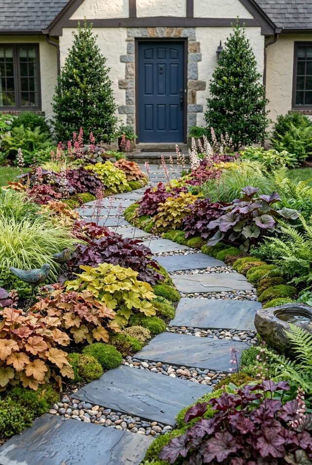 If we’re copying this energy, focus on spacing first. Your stepping stones should feel natural, not like a hopscotch situation gone wrong. Then plant coral bells in slightly irregular clusters so it feels organic. Bonus points if you add a subtle water feature or gravel detail—it instantly elevates the whole scene. Not necessary, but… kinda irresistible.