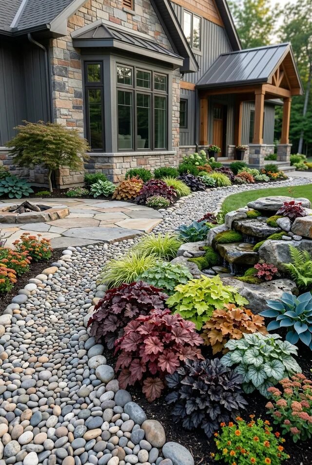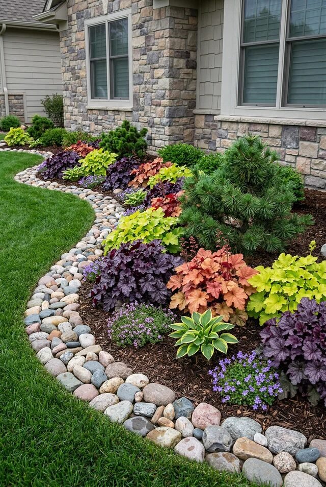 Design-wise, this works because of repetition and color rhythm. The alternating tones of lime, burgundy, and peachy coral bells keep your eye moving, while the river rock border softly defines the space. That curved edge? It’s doing more emotional work than we admit. Straight lines feel stiff; curves feel expensive.