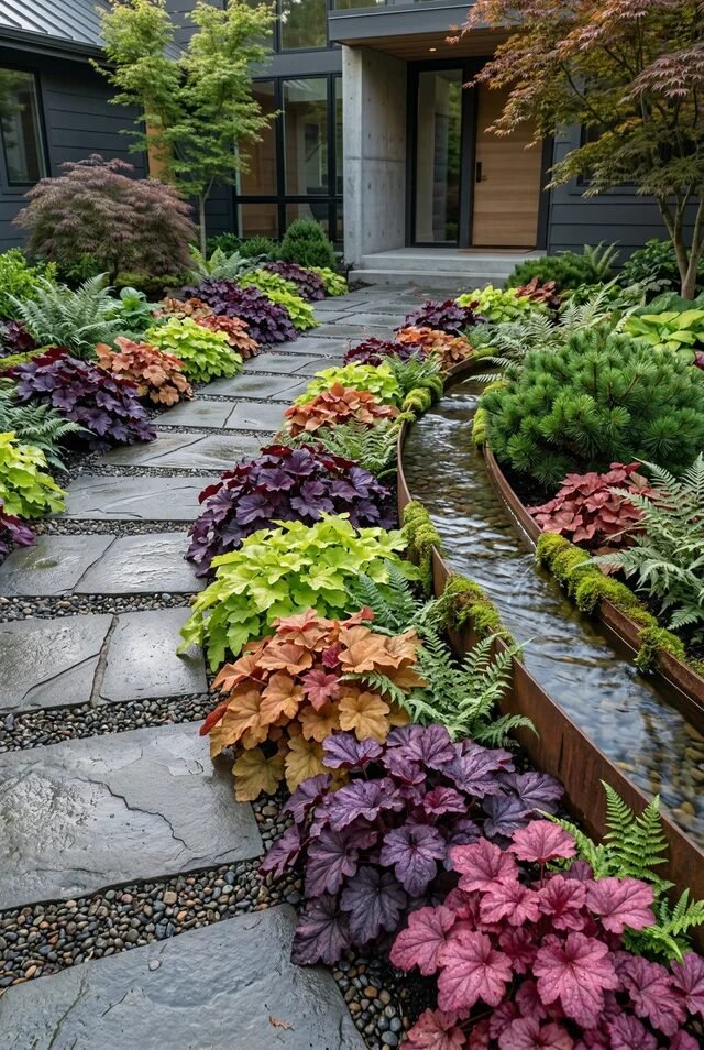 What makes this work is layering with a focal point. The eye naturally moves from the structured house lines to the soft planting, then lands on the cascading water. Coral bells bridge that transition beautifully. They soften everything without stealing the spotlight—honestly, very emotionally mature of them.