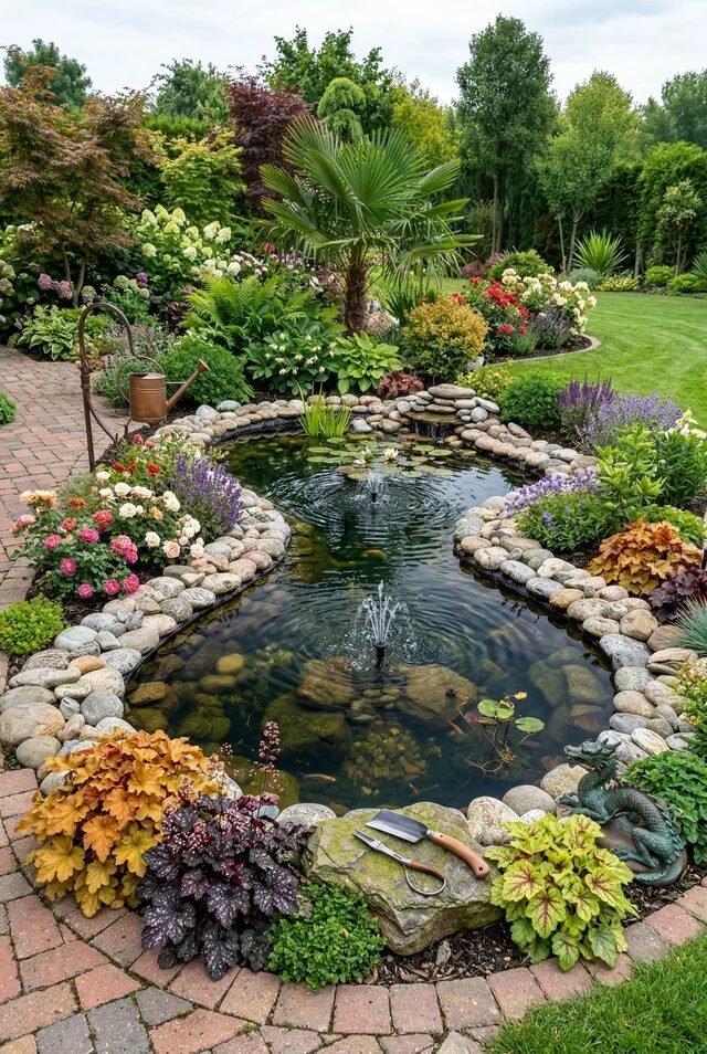 To recreate, don’t overcrowd the pond edge. Let each plant breathe a little so the textures actually read. Mix coral bells with a few flowering perennials for seasonal interest, but don’t overdo it. Keep the palette cohesive so it doesn’t feel chaotic. And please—clean water matters. Murky pond = instant vibe killer.
