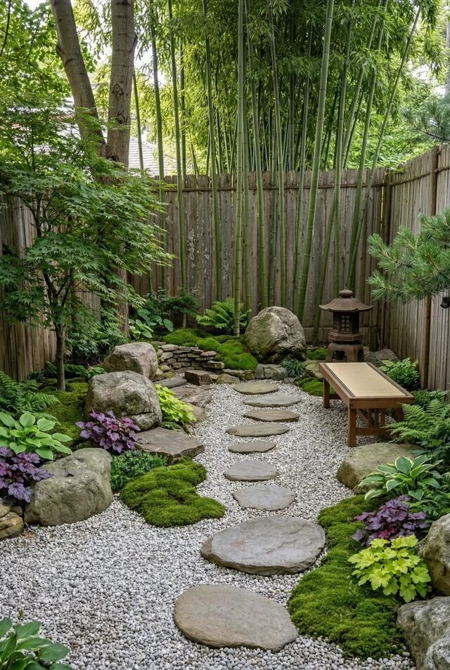 The design principle here is restraint. You’ve got a limited palette—greens, soft purples, natural stone—and a strong focus on texture. Moss, gravel, bamboo, and rock all play different roles, while coral bells quietly add color without breaking the vibe. It’s minimal, but not boring. That’s the fine line.