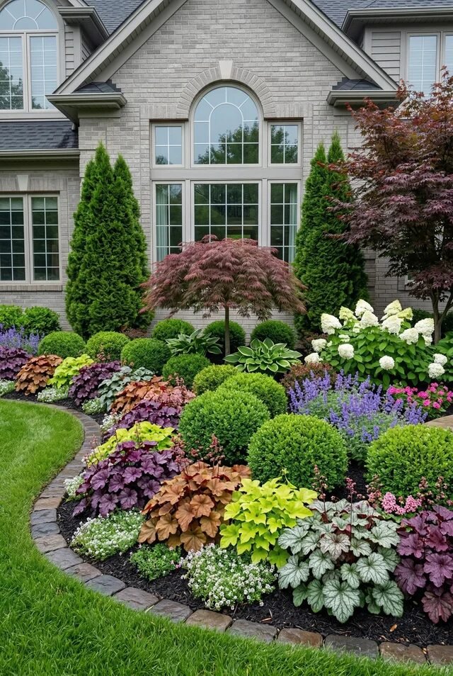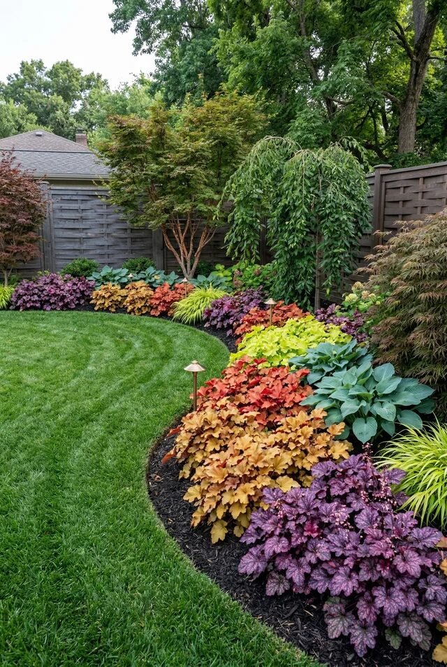 If we want this vibe, start with the curve first. Literally map it out before planting anything. Then layer coral bells in clusters, blending colors gradually instead of placing them randomly. Add a few hostas or ornamental grasses for contrast so it doesn’t feel flat. And keep that lawn edge crisp—because yes, that detail quietly carries the whole look.