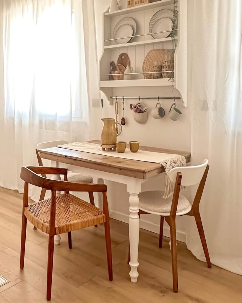 Look closer and you’ll see how materials create interest. The rattan chair, ceramic plates, linen table runner, and wooden boards layer different tactile elements without crowding the room. It’s giving quiet café-in-the-morning energy, which honestly feels kind of elite for such a small setup.