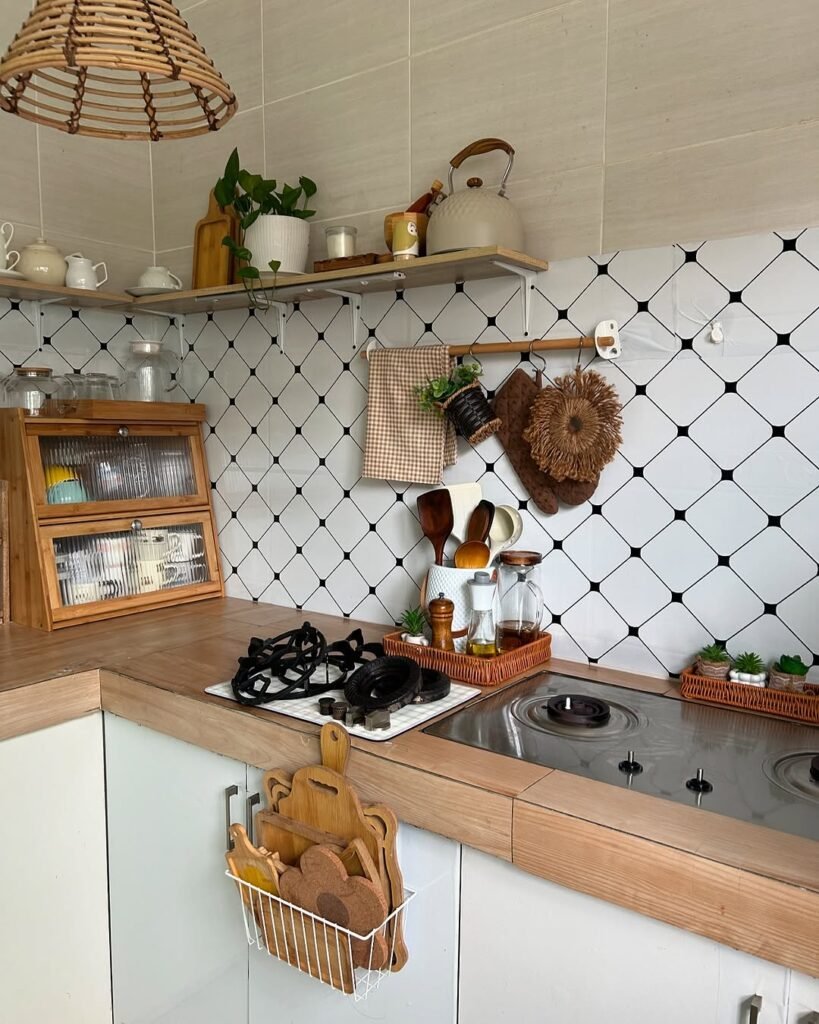 This kitchen is what happens when structure meets personality. The geometric tile backsplash brings strong visual contrast, while warm wooden countertops soften the look so it doesn’t feel too modern. Boho kitchens thrive on this kind of tension — mixing clean patterns with natural materials.