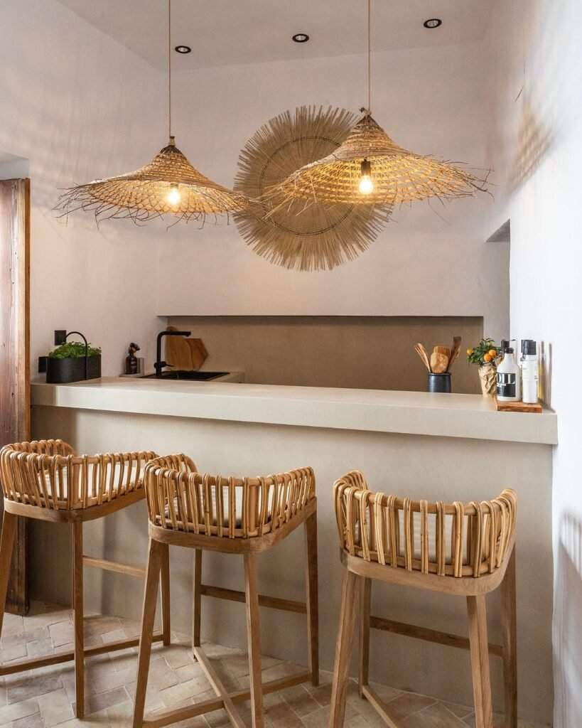 The rattan stools echo the lighting above, which creates visual rhythm. Designers call this repetition, but we can just call it good taste. When materials repeat across the space, everything feels intentional rather than random. And honestly, those sculptural lamps look like they belong in a boutique hotel bar somewhere in Bali.