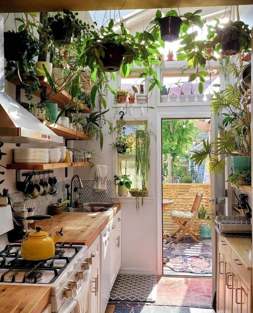 This kitchen is proof that small spaces can absolutely have main character energy. Instead of fighting the narrow layout, the design embraces vertical layering. Plants hang from the ceiling, trail along shelves, and fill the window frames, turning the entire kitchen into something that feels halfway between a greenhouse and a Sunday morning café.