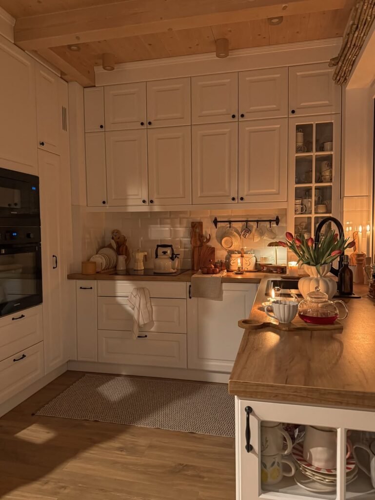 If you want to recreate this cozy vibe, start with warm materials: wood counters, neutral cabinets, and soft textiles like rugs or tea towels. Then introduce ambient lighting — candles, warm bulbs, maybe a small lamp if your layout allows it. Suddenly the kitchen stops feeling purely functional and starts feeling like a place where you actually want to linger… preferably with tea and a slightly dramatic life conversation.