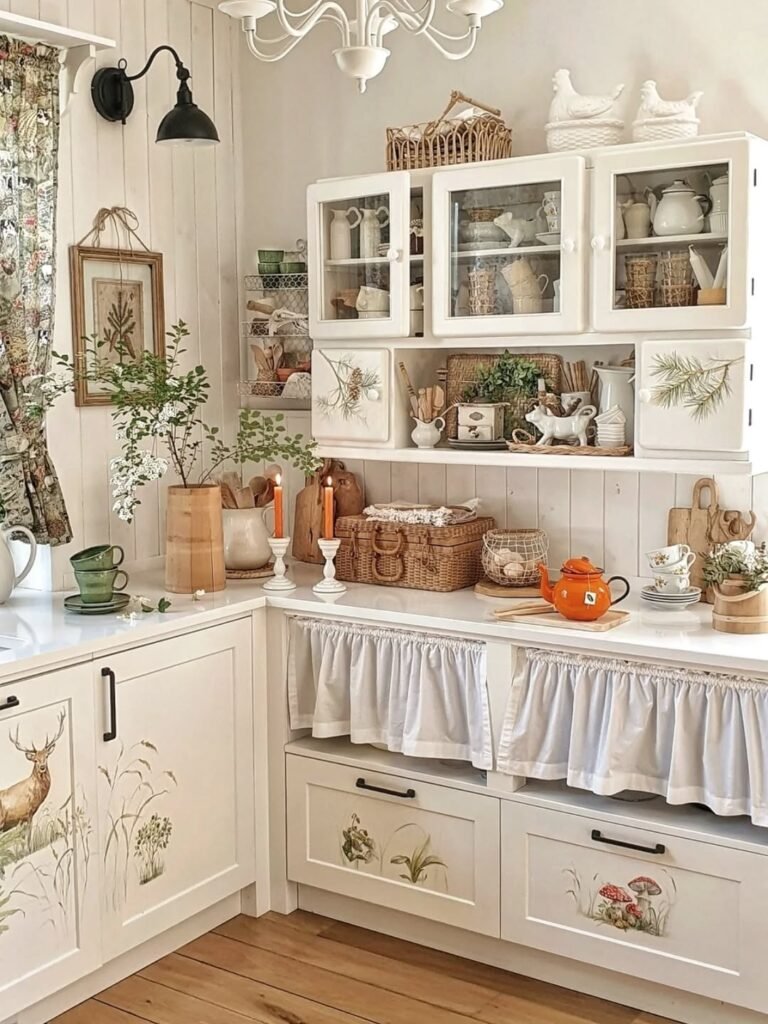 If you’re recreating this style, start with a neutral cabinet base and then slowly add vintage-inspired accessories — ceramics, woven baskets, botanical artwork, maybe a quirky teapot or two. The goal isn’t perfection. It’s personality. The kind that makes guests quietly snoop around your kitchen shelves.