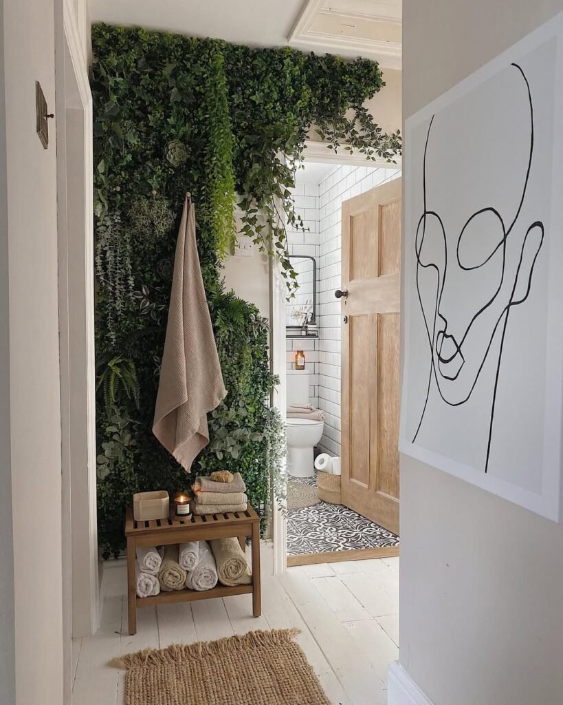 The design works because everything else steps back. White walls, simple wood bench, neutral textiles. The greenery becomes the focal point, so the rest of the space stays intentionally quiet. It’s basically visual hierarchy done right, without overcomplicating it.