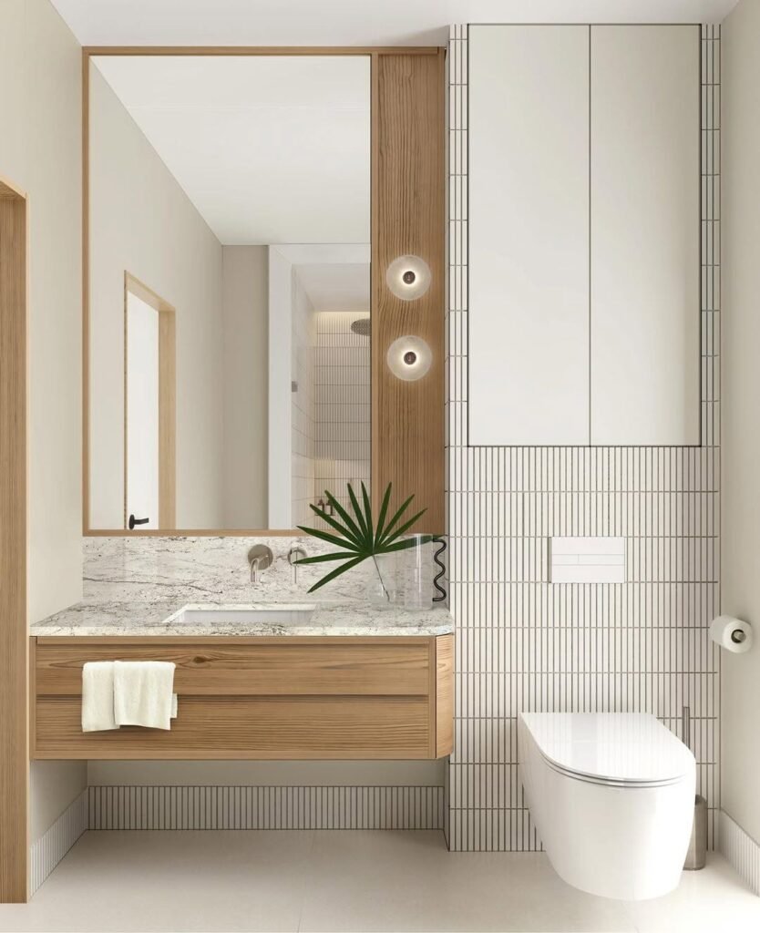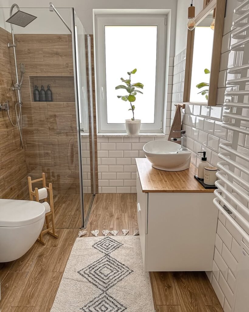 Design-wise, it’s all about repetition. Wood shows up in the floor, vanity top, and shower wall, tying everything together without overthinking it. Consistency in materials is doing the heavy lifting here, and that’s why it feels calm instead of chaotic.
