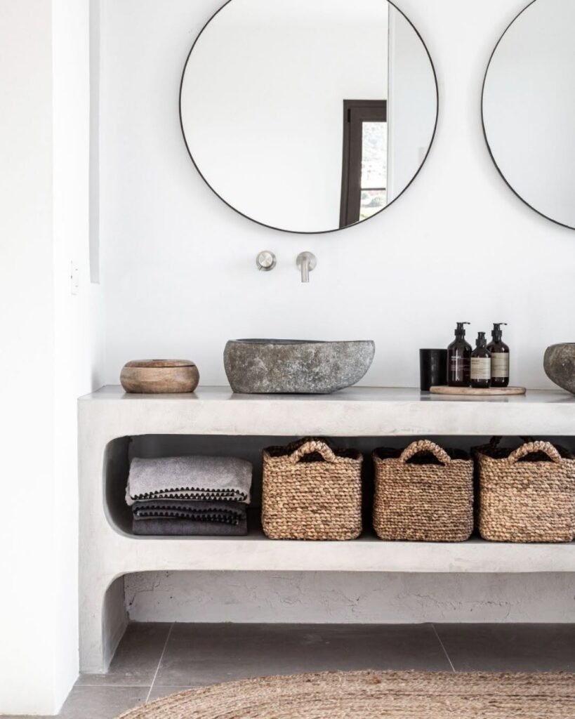 The magic here is texture layering. Smooth concrete, rough stone, soft textiles, woven fibers. When color is minimal, texture becomes the personality—and this space fully understands the assignment. Even the round mirrors soften the structure just enough.