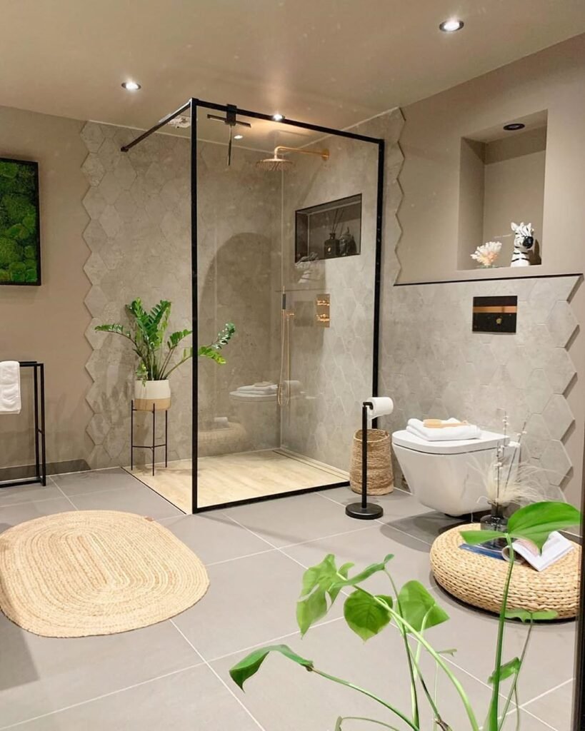 What makes this work is structure. The black-framed shower creates a visual boundary, almost like zoning the space without walls. Then the woven textures and plants soften the grid. It’s a perfect example of contrast through form, not color. Subtle, but smart.