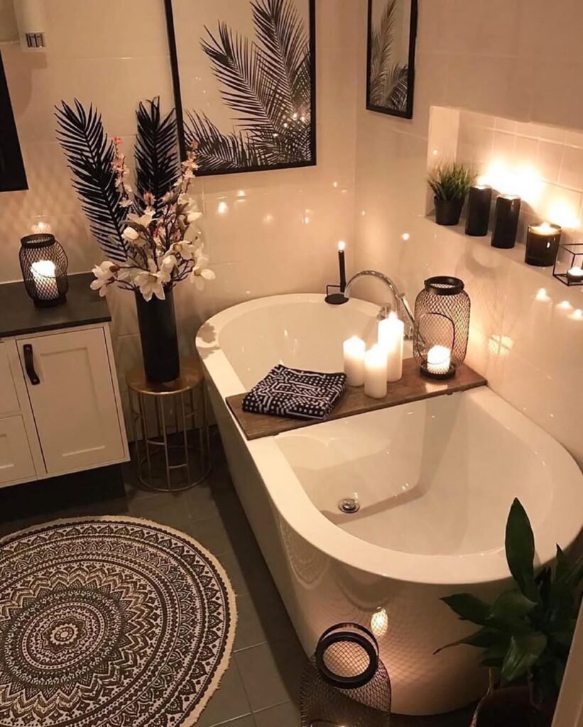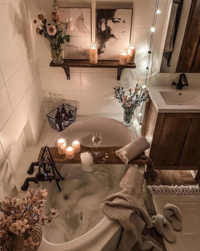 If we want to recreate this, we need restraint and intention. Stick to a cohesive color story—think blush, cream, soft browns. Add height variation with candles and florals. And please don’t overcrowd the tub tray. Two or three items max. We’re curating a vibe, not setting up a mini grocery store next to the bath.
