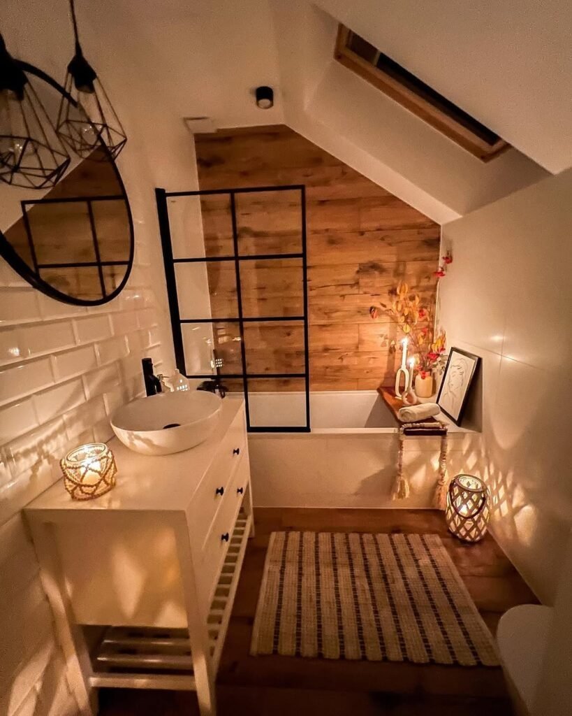 This one? She’s not trying to be Pinterest-perfect, and that’s exactly why it works. The sloped ceiling could’ve been awkward, but instead it creates this tucked-in, almost secret spa vibe. Add candlelight, and suddenly we’re emotionally attached to a bathroom. Wild.