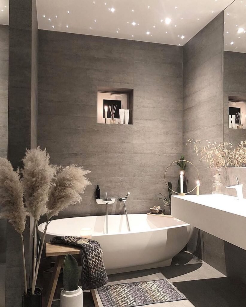 We don’t talk enough about dark bathrooms—and honestly, we should. This one is giving calm, grounded, slightly mysterious energy, like the introvert friend who somehow has the best taste. The matte grey walls absorb light in the most flattering way, while that soft glow above creates a quiet little moment. It’s not loud, but it’s definitely felt.
