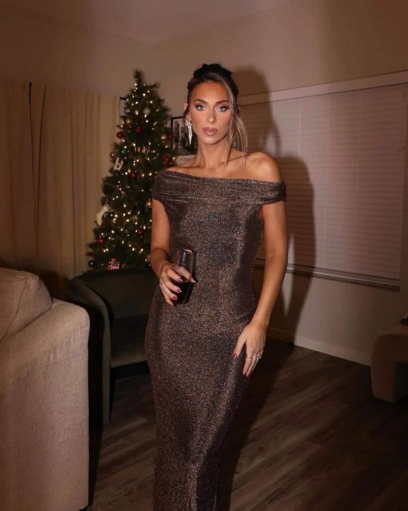 You know it’s holiday season when we start justifying glitter as a neutral. This bronze off-shoulder gown screams “I’m the champagne of this event.” The genius behind this look? Strategic exposure and tonal shimmer. The off-shoulder cut highlights the collarbone (the most underrated elegant zone), while the body-skimming fit keeps it tasteful, not tacky.